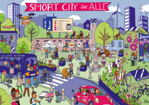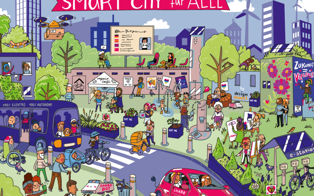Smart City für alle Wimmelbild Illustration Stadtbild inklusiv