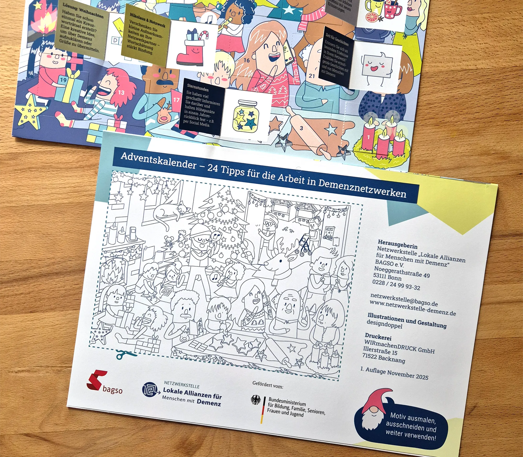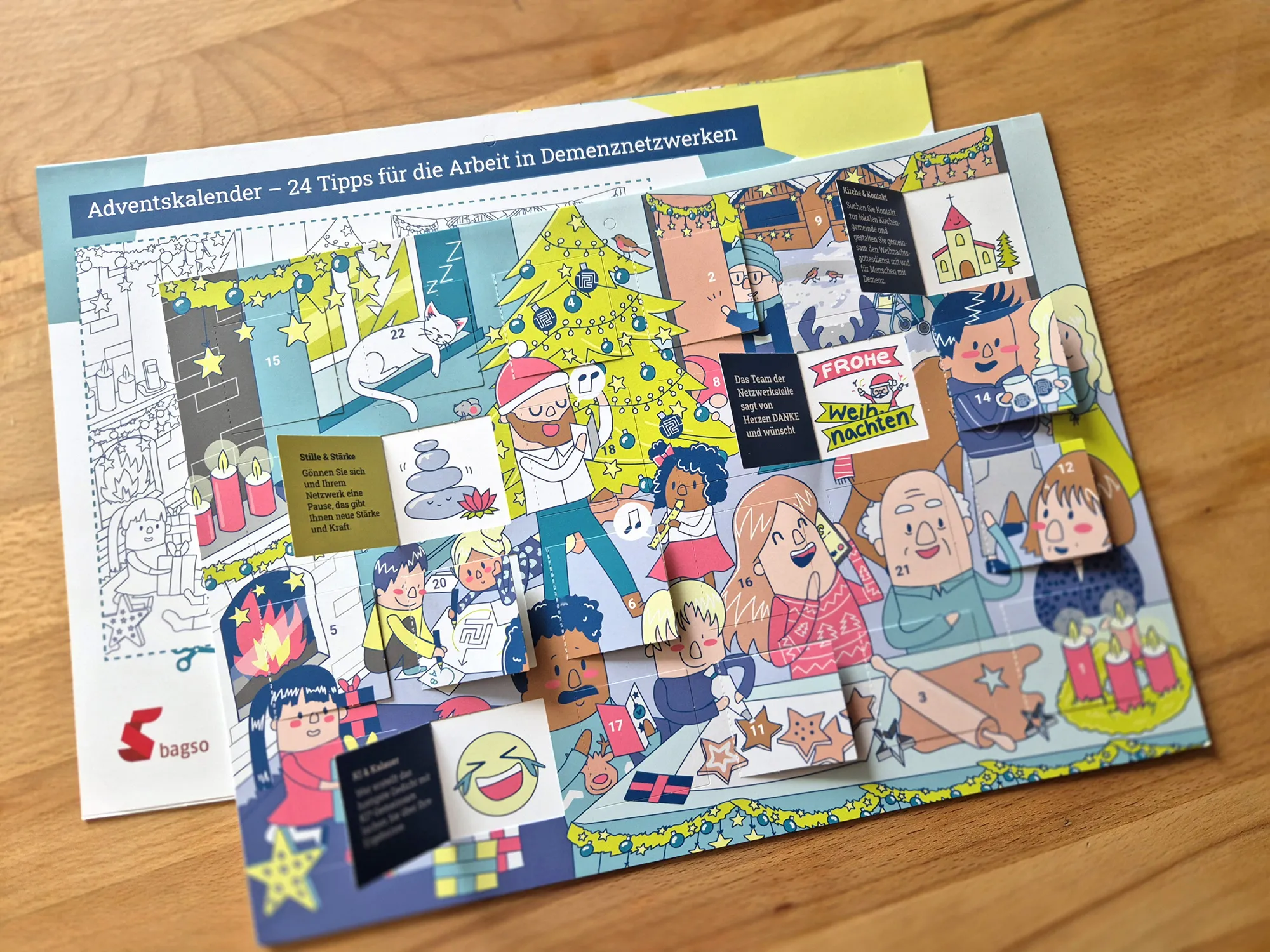 BAGSO – Bundesarbeitsgemeinschaft der Seniorenorganisationen bzw. die Netzwerkstelle Lokale Allianzen für Menschen mit Demenz, entwickelten wir einen illustrierten Adventskalender mit 24 Netzwerk-Tipps für Demenznetzwerke.
